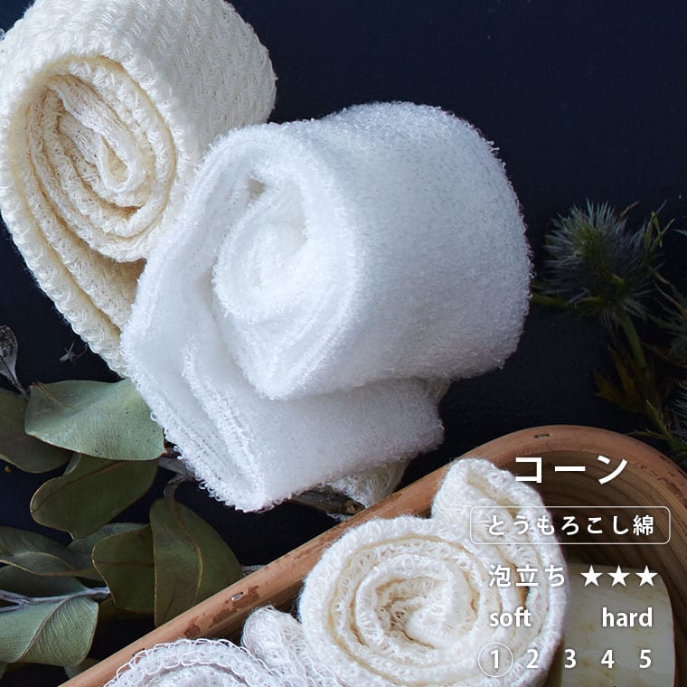 天然素材でここまで泡立つ!やっぱり天然素材が好きだけど、天然素材って、泡立たない感じがする… 天然素材といえば泡立ちにくく使いにくい、といった短所がありました。 そこでBless.シリーズは、ユニチカテラマック・ポリ乳酸というトウモロコシを主原料とした新素材の繊維を混合、天然素材を使用していると思えないほどにモコモコの泡が! Bless.誕生から10年。 感謝の気持ちを込めてリニューアル〜。 編み方や糸を見直して、もっともっと泡立ちやすくなりました! そして、待望のコーン素材100%が新登場ですっ。天然素材×天然素材=人間の肌に近い弱酸性ユニチカテラマック・ポリ乳酸って何…? とうもろこしを主とする再生可能な植物資源を原料に合成された、天然由来のポリマー。 最終的には自然環境下で元の炭酸ガスと水に分解される地球にやさしい素材です。 そんなスゴイ素材ポリ乳酸100%、きめ細かい泡でやさしい「コーン」。 綿と混ざっていないのでその色は光沢感のある白。 コーン繊維は抗菌性に優れた衛生的な素材で、健康な肌と同じ弱酸性です。ブレスは、泡立ちや素材の固さを選べますこちらは、Bless.(ブレス) コーン の販売ページですとうもろこしの繊維が濃密泡〜食べたくなってしましそうな、ふわトロな泡を誕生させるには、水は少な目がよいですよ〜。 ちょっとづつ水分を足す感じで。 せっかくの天然素材なので、石鹸もマルセイユ石鹸などの天然素材が相性抜群◎ お風呂MEDIA (公式サイトへ移動します) ボディタオルの選び方 お風呂でヘアケアは男女&全年代必須!!お風呂と美容の調査報告 ふわふわ&もこもこ!石鹸の泡立て方 バスタイムを美容タイムに!お風呂と美容の深~い関係 お風呂の効果って?基本や目的別の入浴法をご紹介 良い睡眠は良い入浴習慣にあり!眠りとお風呂の関係 商品名ボディタオル「ブレス(Bless.)」コーン商品説明Bless.(ブレス)とは『恵み』という意味。 Bless collectionは、自然の恵みを素肌に感じられる天然由来のバスグッズシリーズです。 ブレスボディタオルは、厳選した天然素材にユニチカテラマック・ポリ乳酸(コーン繊維)を混合することにより、豊かな泡立ちを可能にしました。熟練の国内メーカーが編み上げた、上質な質感をお楽しみください。 ※ポリ乳酸とは、とうもろこしを主とする再生可能な植物資源を原料に合成された、天然由来のポリマー。自然環境下でもとの炭酸ガスと水に分解される、地球に優しい素材です。 【コーン】 コーン繊維は抗菌性に優れた衛生的な素材で、健康な肌と同じ弱酸性です。 きめ細かい泡がたち、やさしい肌触りです。 ※ご利用のモニター環境により色味に差異が生じる場合がございます。サイズ・素材約25×90cm ポリ乳酸100%生産地日本製ご注意肌を傷めないように、こすりすぎにご注意ください。 お肌の弱い方・乳幼児・アレルギー体質の方・及び皮膚に異常のある場合は使用しないでください。 ご使用後はよくすすぎ、水けを切って風通しのよいところで陰干ししてください。JANコード4545229152452